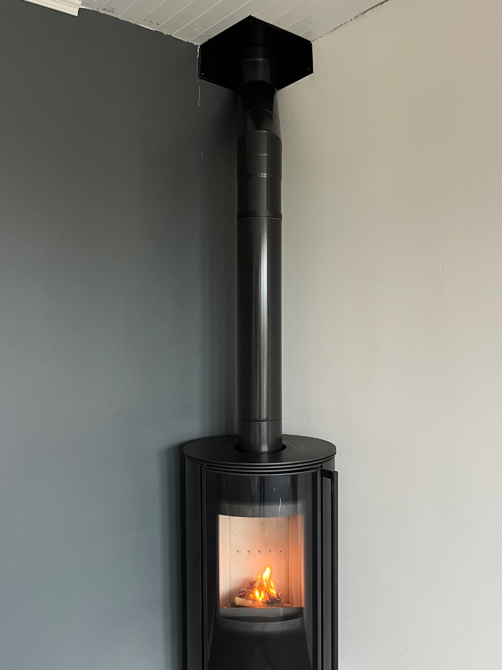 Ce modèle "Erik" simple et esthétique, de seulement 6kW remplace avantageusement l'ancienne cheminée et permet de chauffer confortablement un grand salon ainsi que la chambre parentale qui se trouve au-dessus par convection naturelle vers la cage d'escalier.